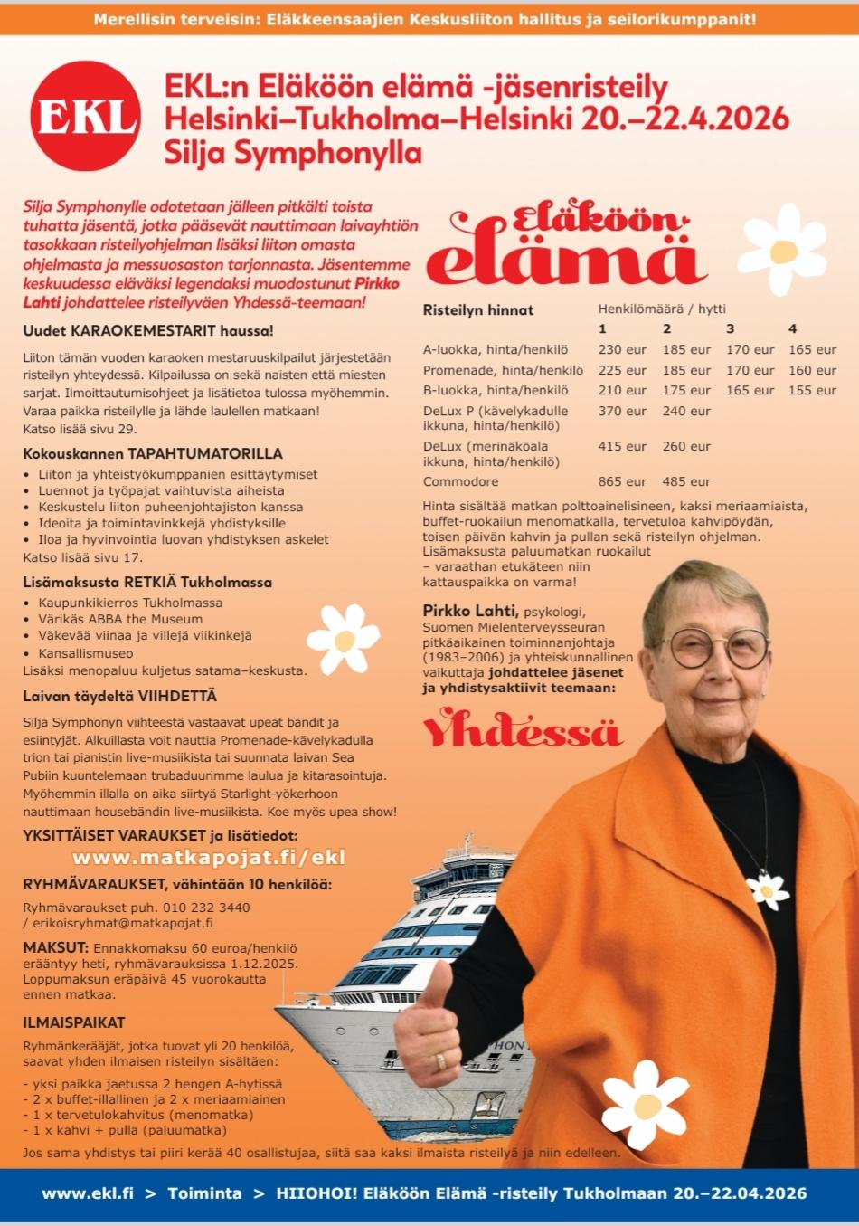 Varaa paikka risteilylle viikkotapaamisissa tai sähköpostilla lillian.kulmala@gmail.com