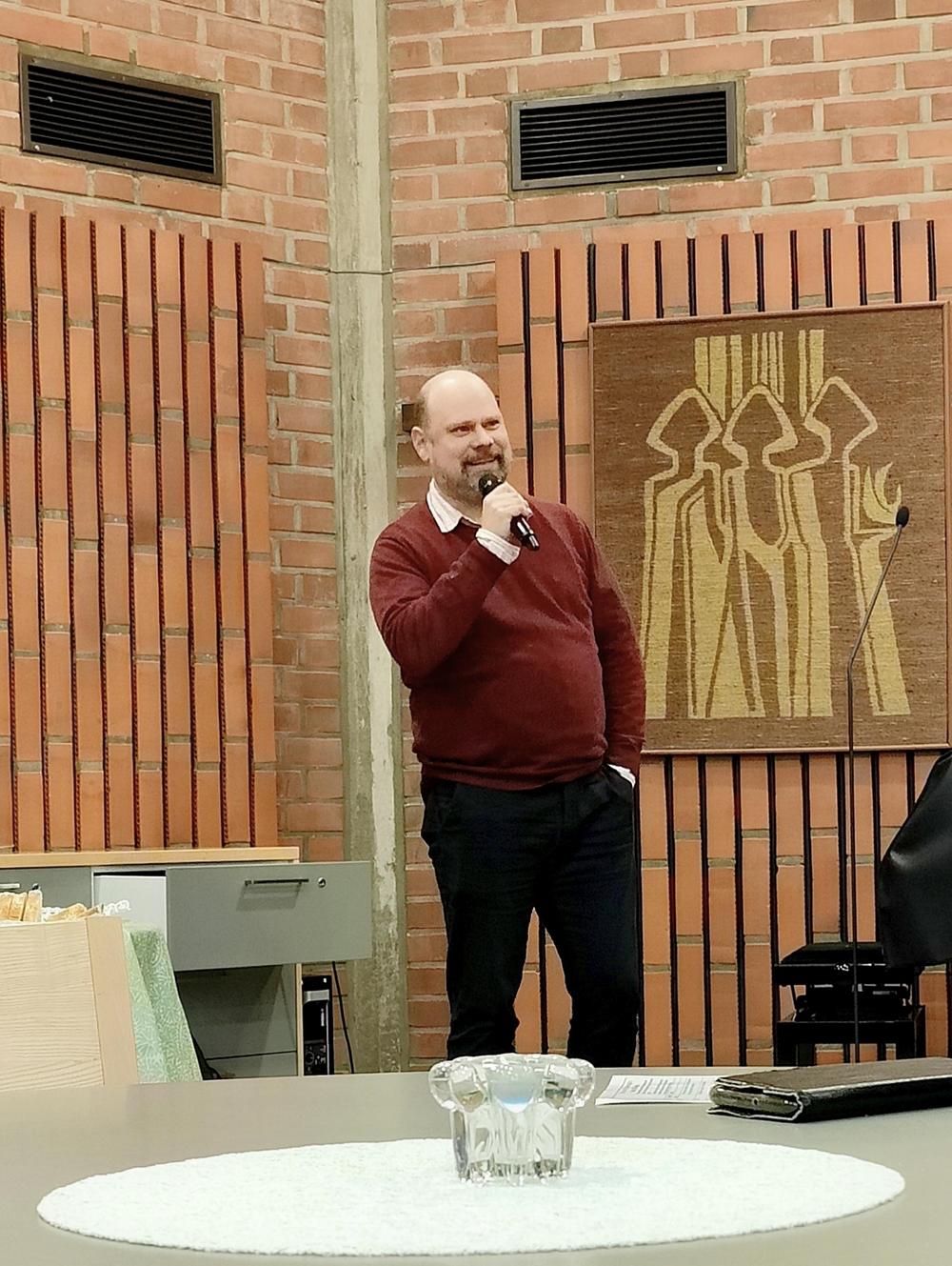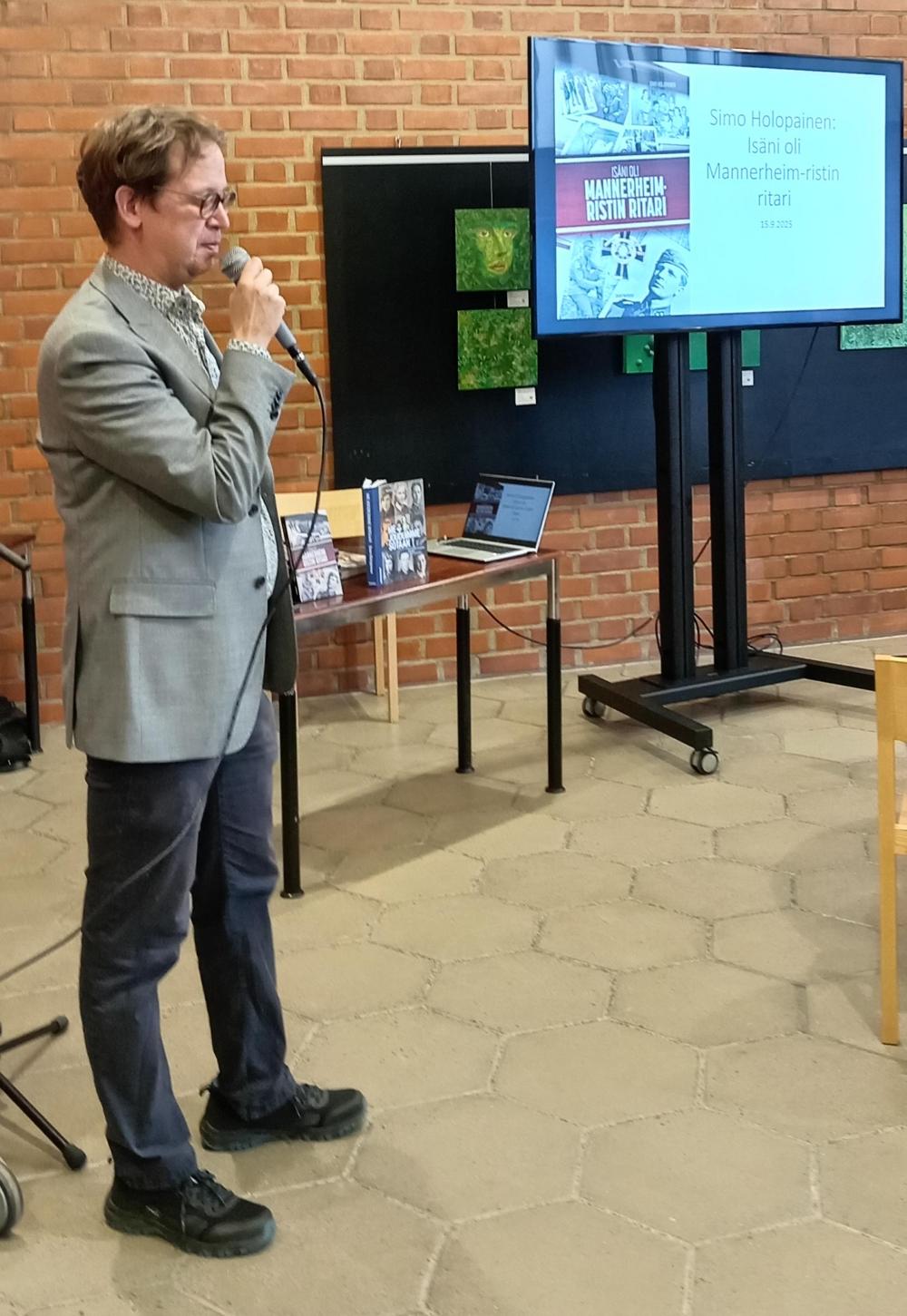 Vierailija kertoi kirjastaan, joka on tehty haastattelemalla 10 Mannerheim-ristin saaneen ritarin omaisia, lapsia ja lapsenlapsia. Yleisinä piirteinä oli, että ritarit eivät puhuneet sodasta lapsilleen, mutta myös siitä, että ritareista osa näki myöhemmin painajaisia sodasta.