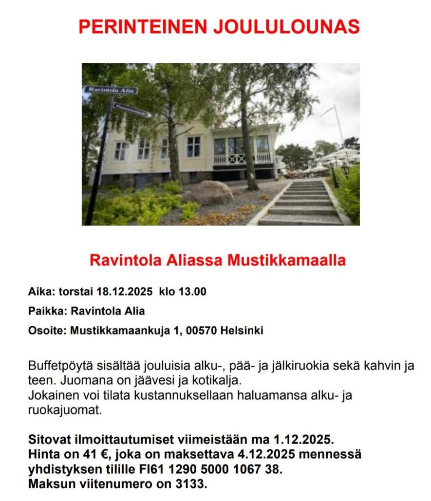 Lisätiedot pyydämme varauksen jälkeen.