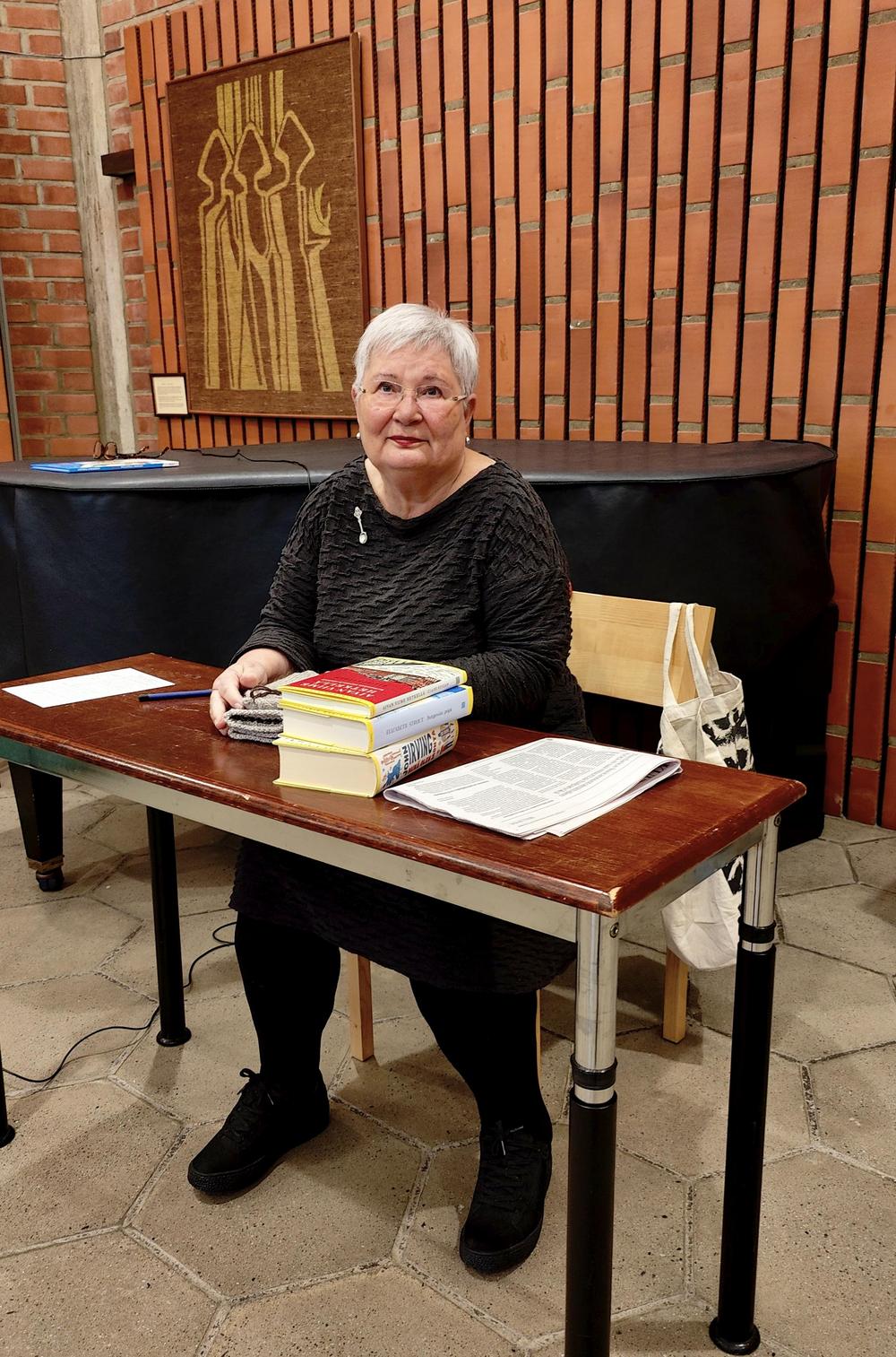 Vierailija kertoi kirjastaan, joka on tehty haastattelemalla 10 Mannerheim-ristin saaneen ritarin omaisia, lapsia ja lapsenlapsia. Yleisinä piirteinä oli, että ritarit eivät puhuneet sodasta lapsilleen, mutta myös siitä, että ritareista osa näki myöhemmin painajaisia sodasta.