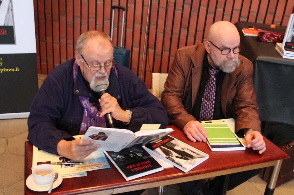 Toimittaja Kari Varvikko (vas) esittelee kirjoittamiansa kirjoja ja vastaa haastattelijan (oik) kysymyksiin